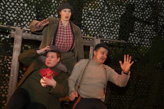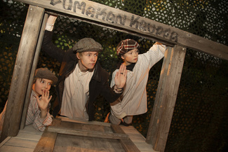 Pauli, Eero ja Sauli kurkistelemassa ikkunasta Lomakan kauppaan.